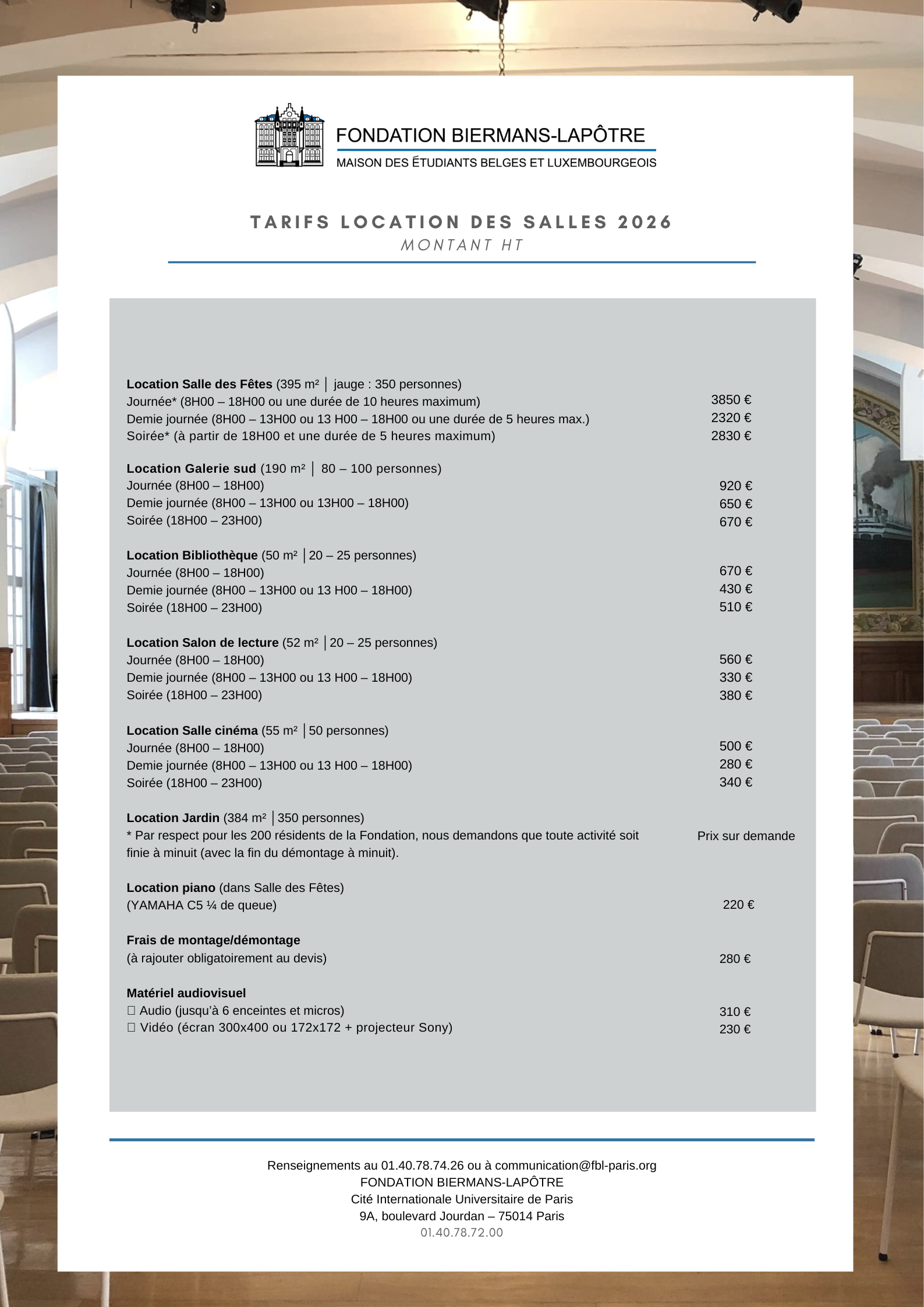 Découvrez des espaces uniques pour organiser vos conférences, concerts, spectacles, séminaires, et plus encore, au cœur de la Maison des étudiants Belges et Luxembourgeois CIUP.